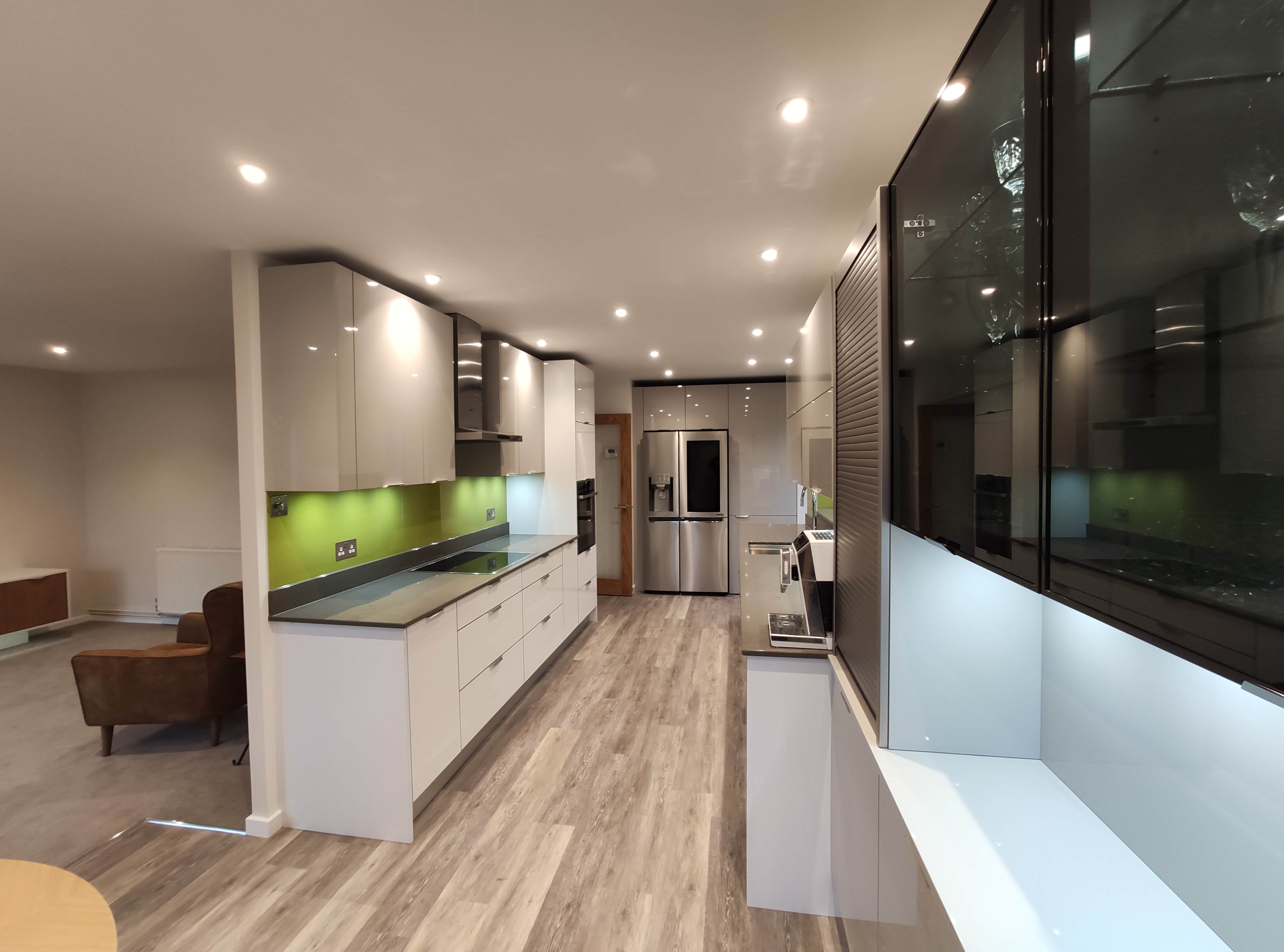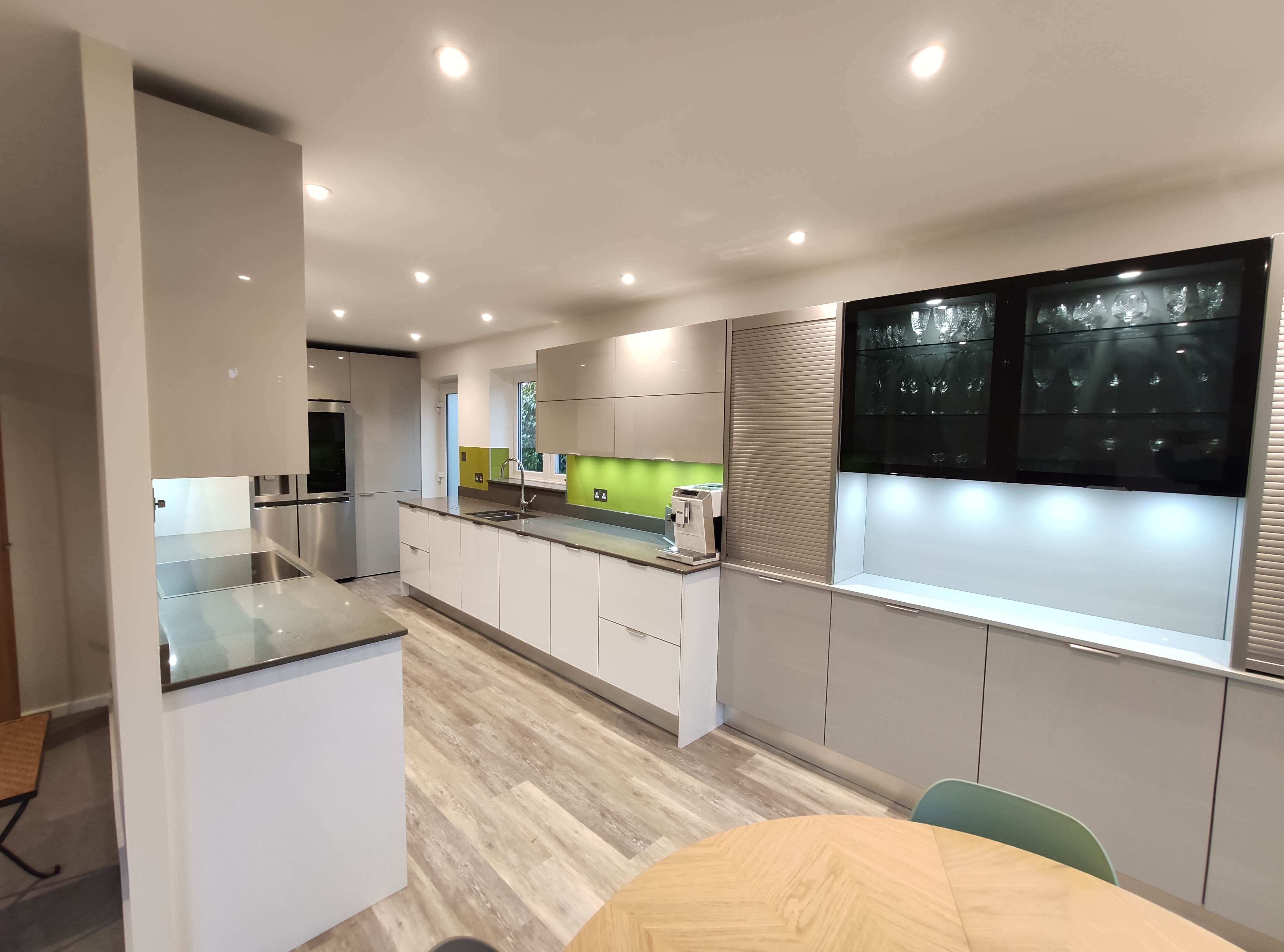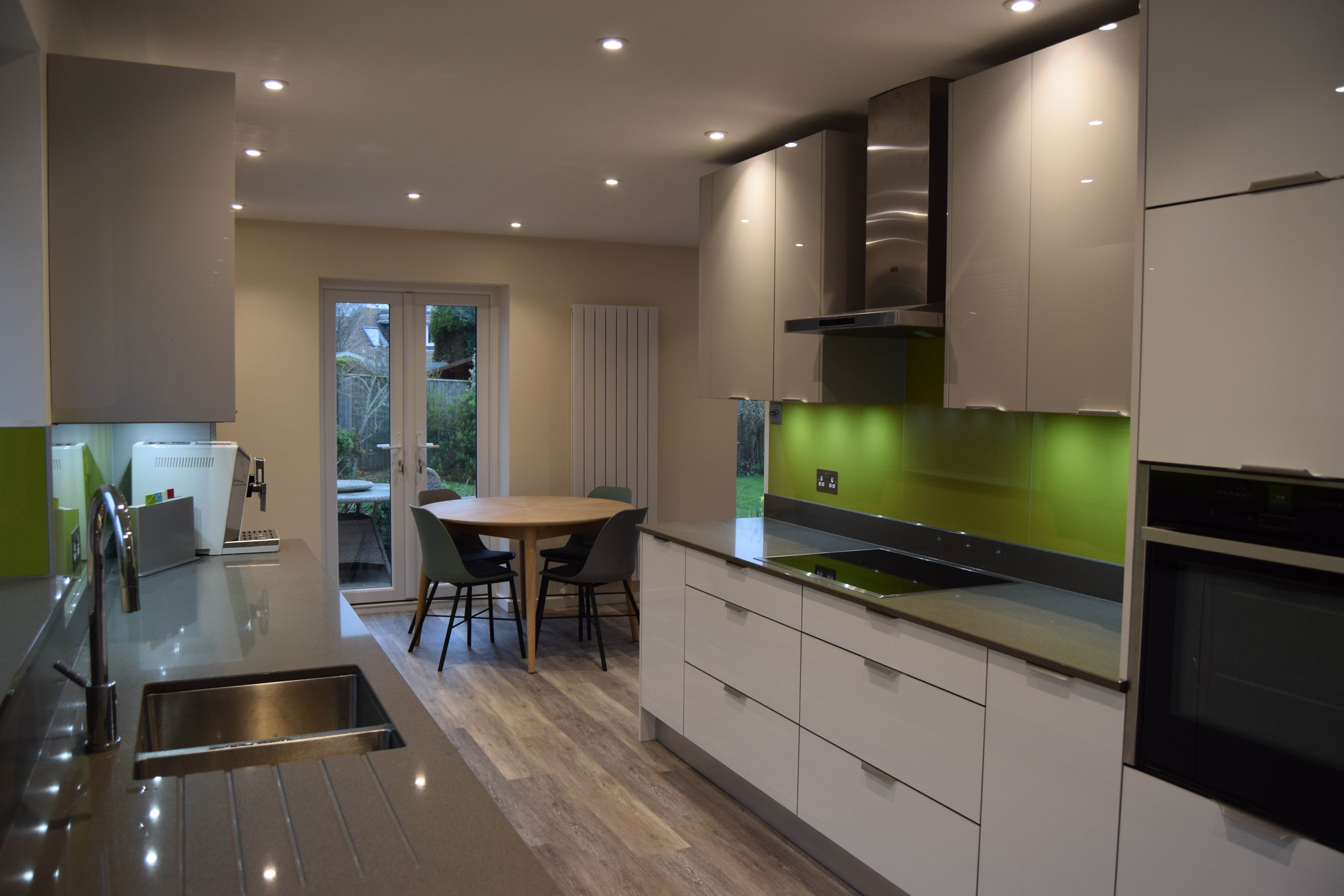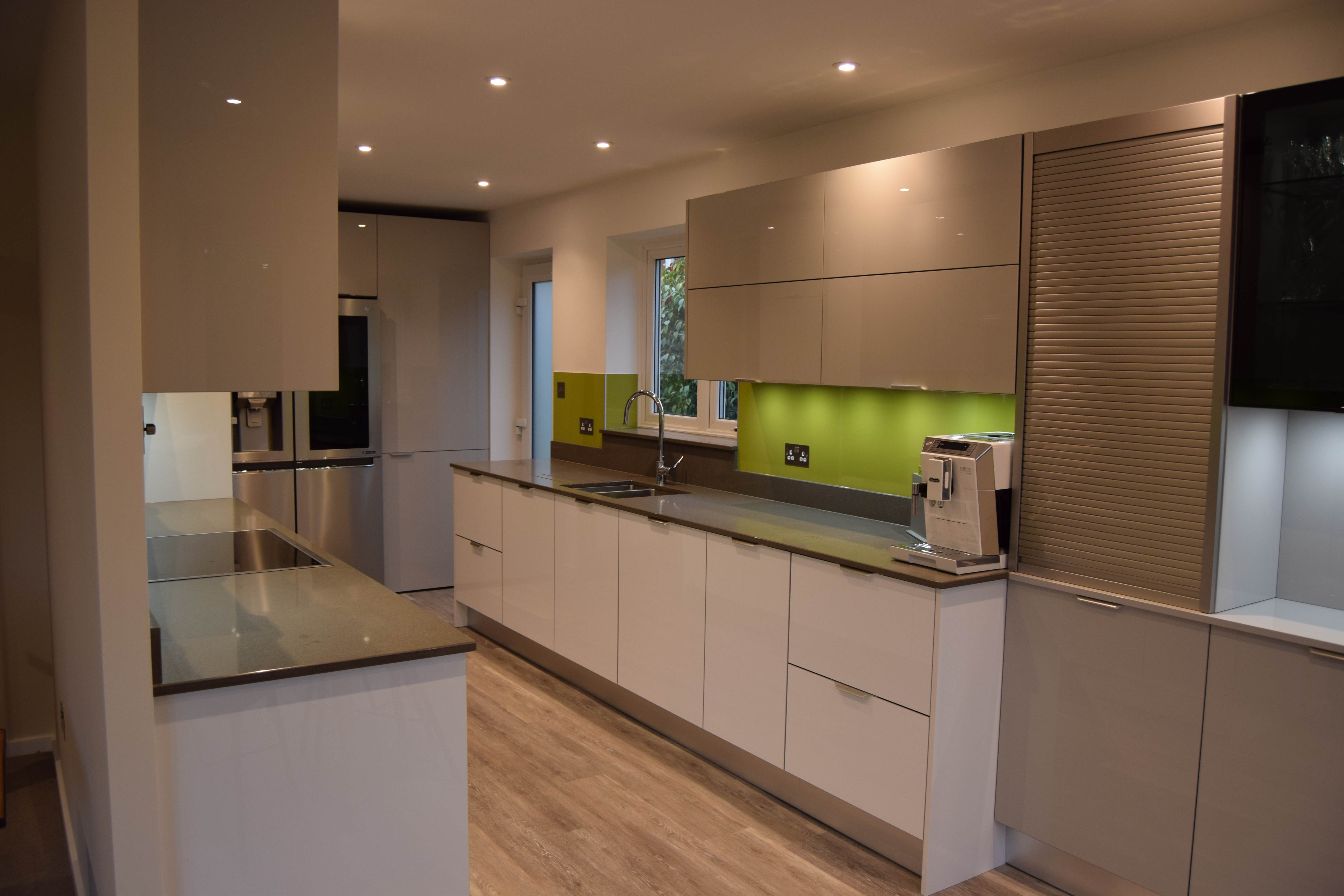 Complete kitchen re fit, supply and installation of new units, quartz worktops. Alusplash splash-backs.