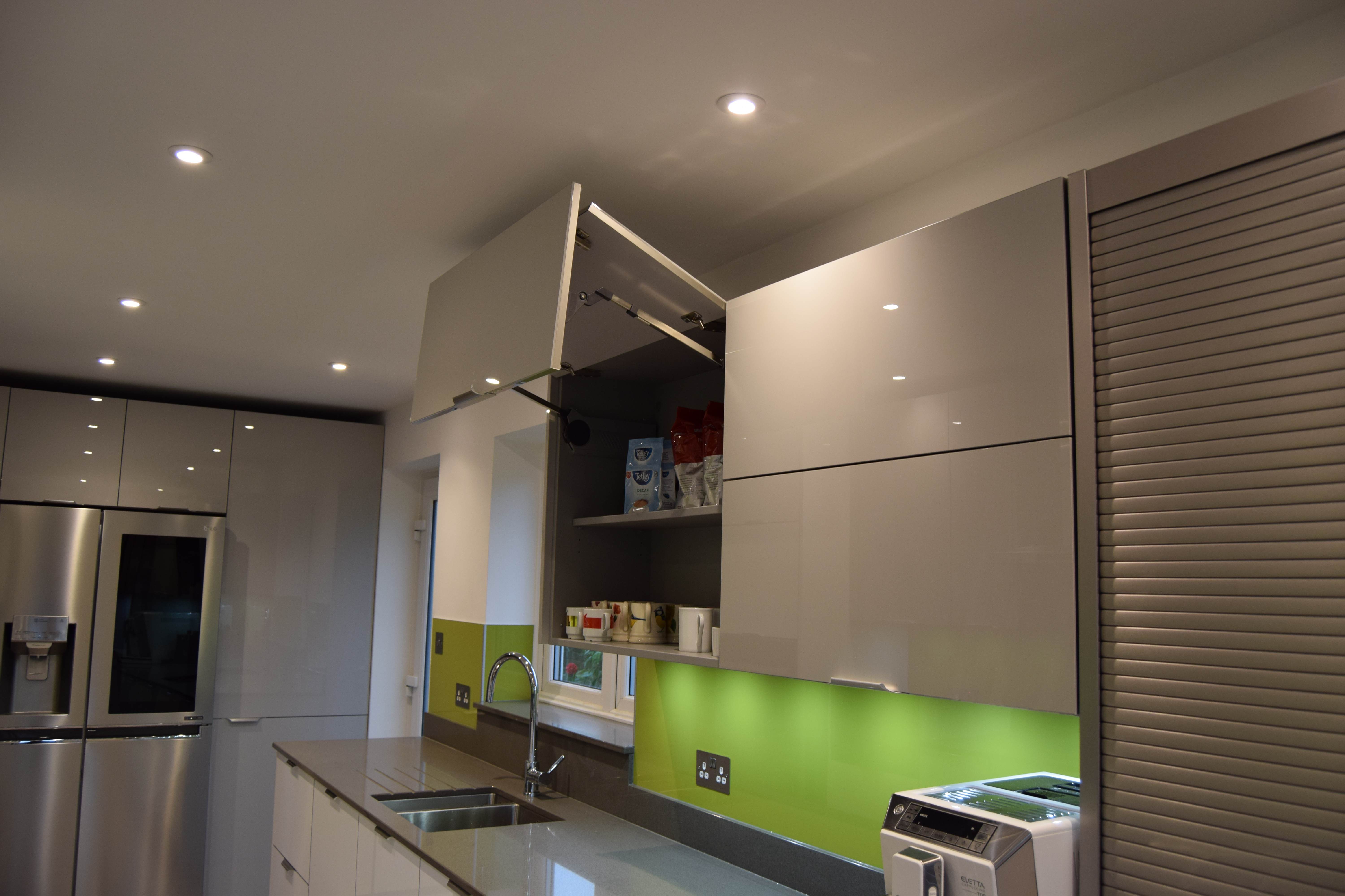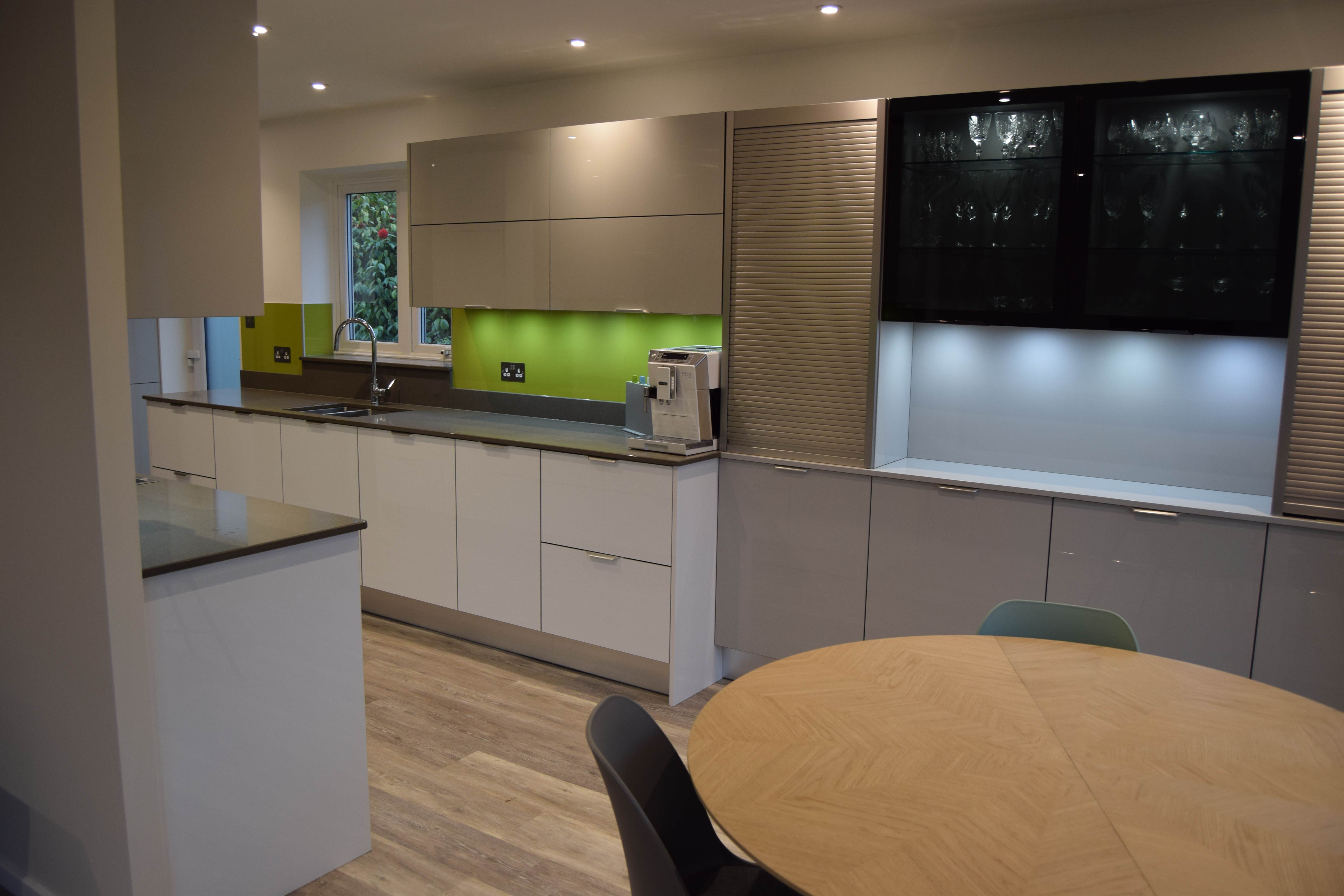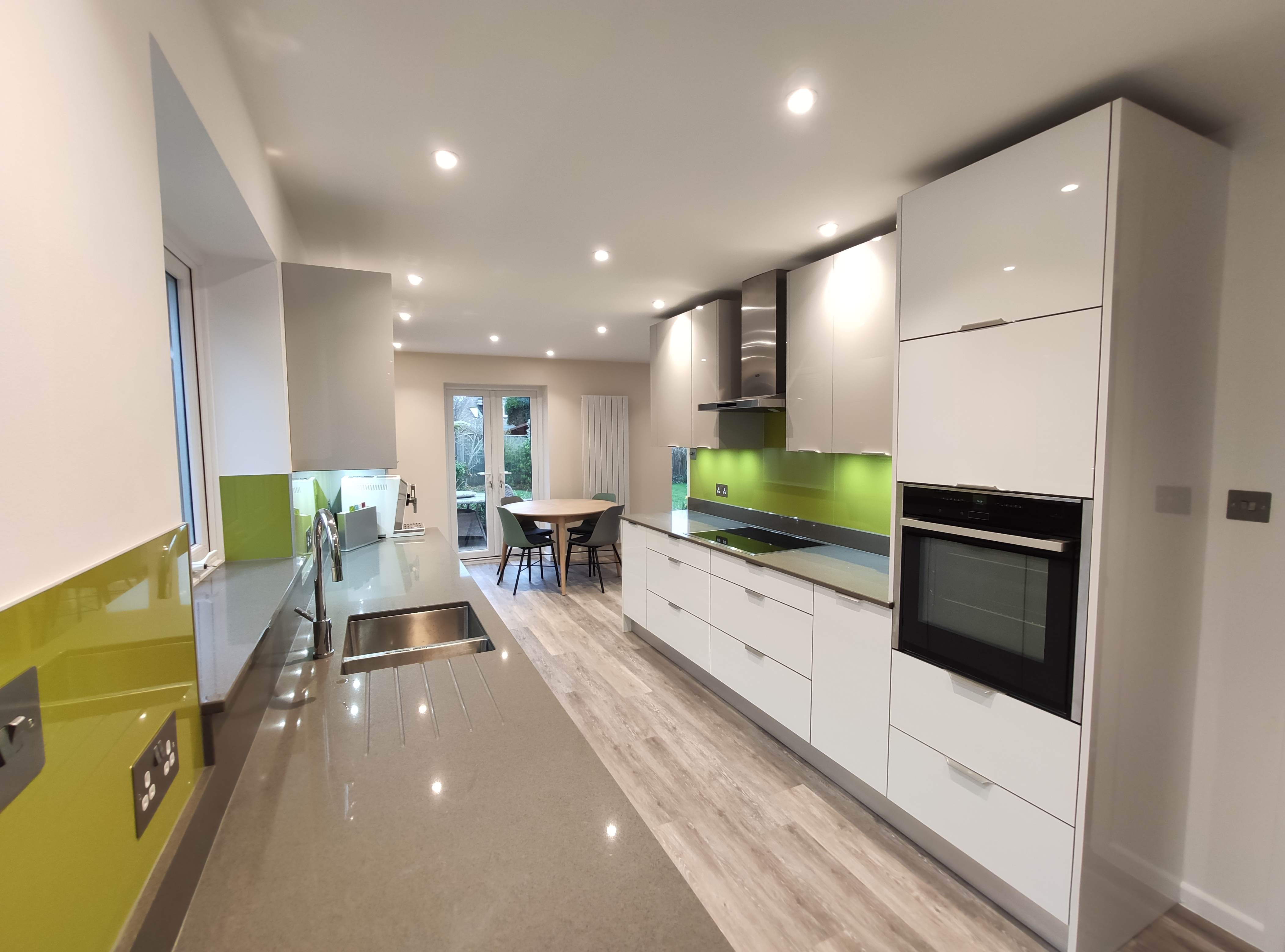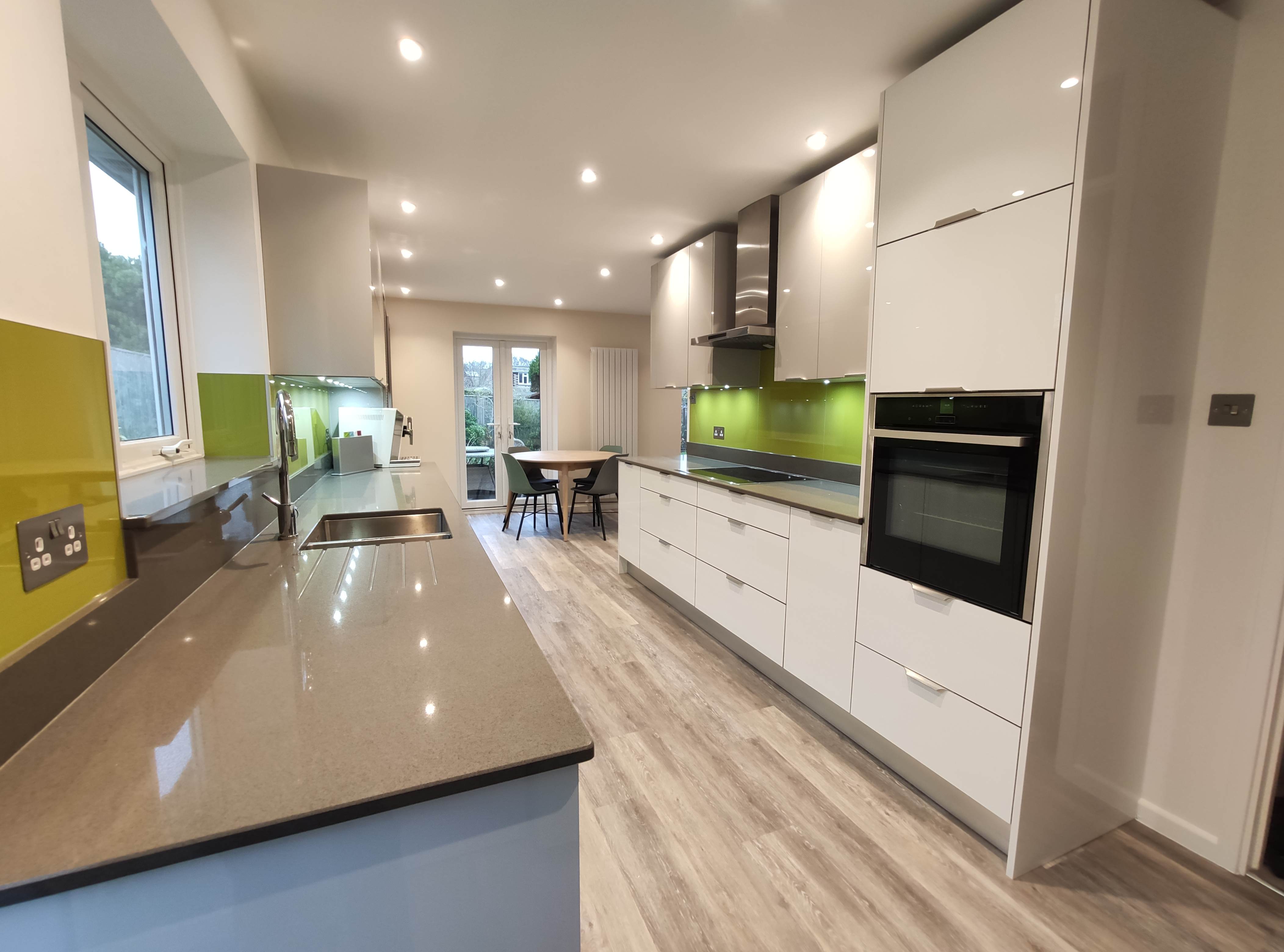 Complete kitchen re fit, supply and installation of new units, quartz worktops. Alusplash splash-backs.