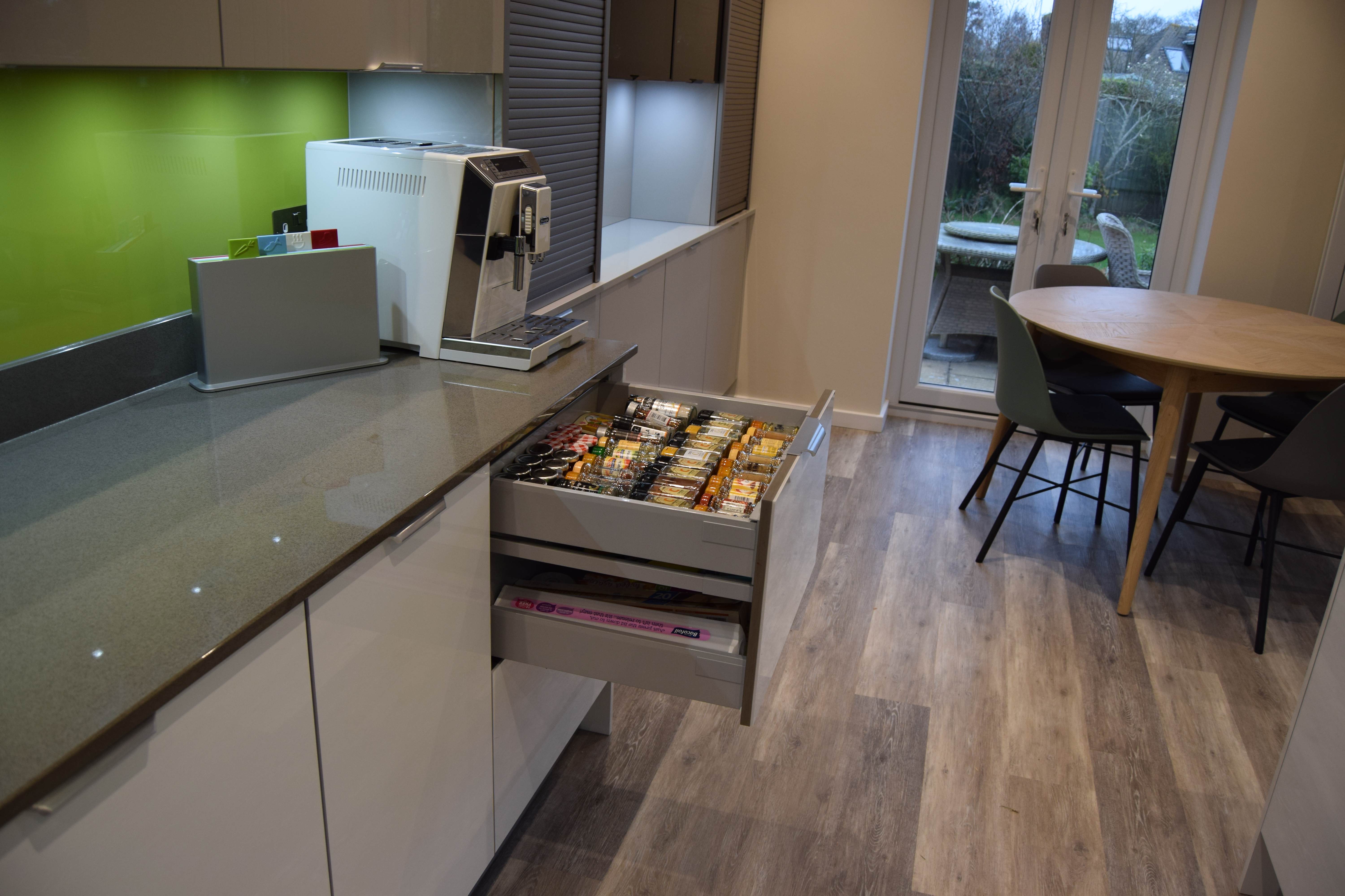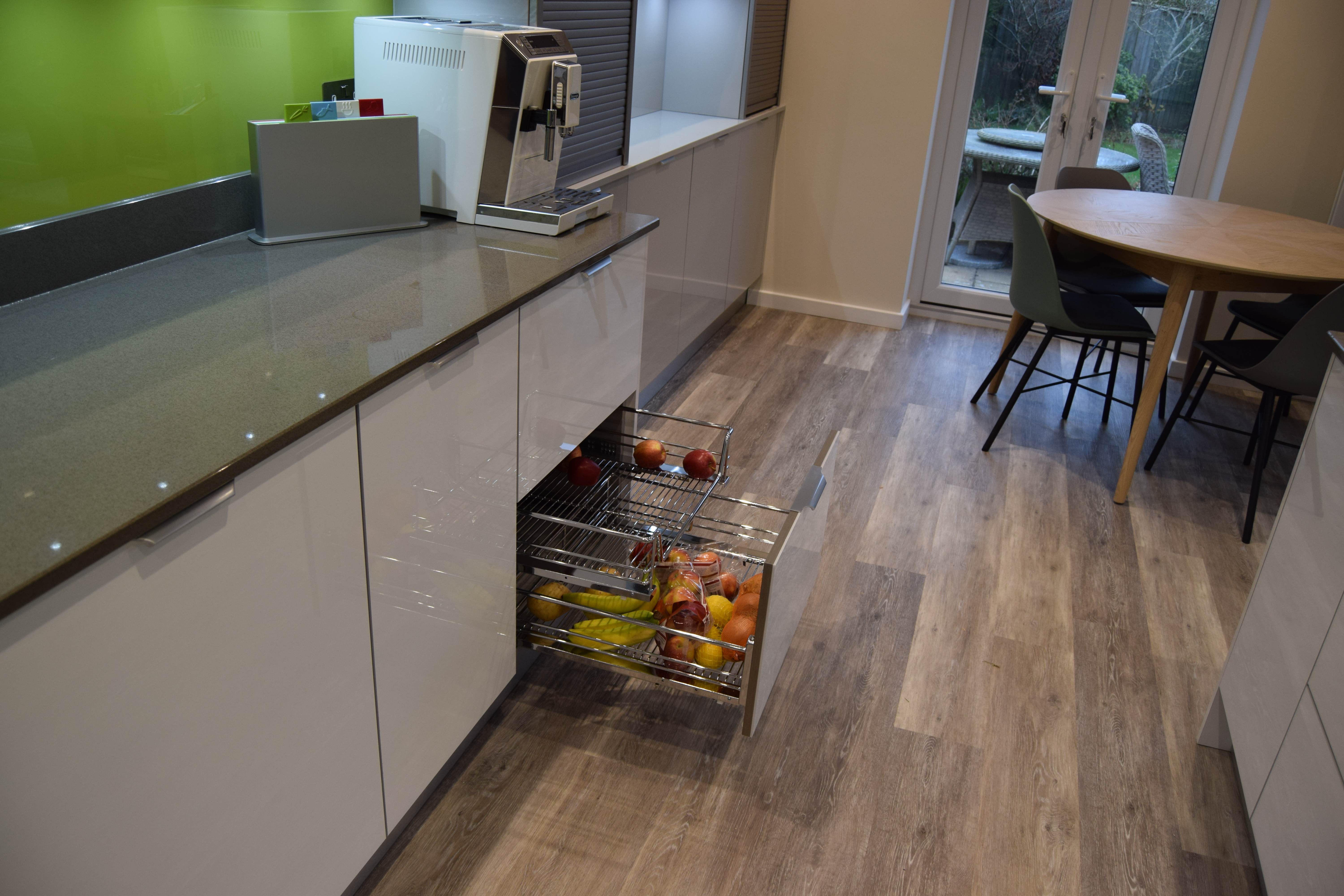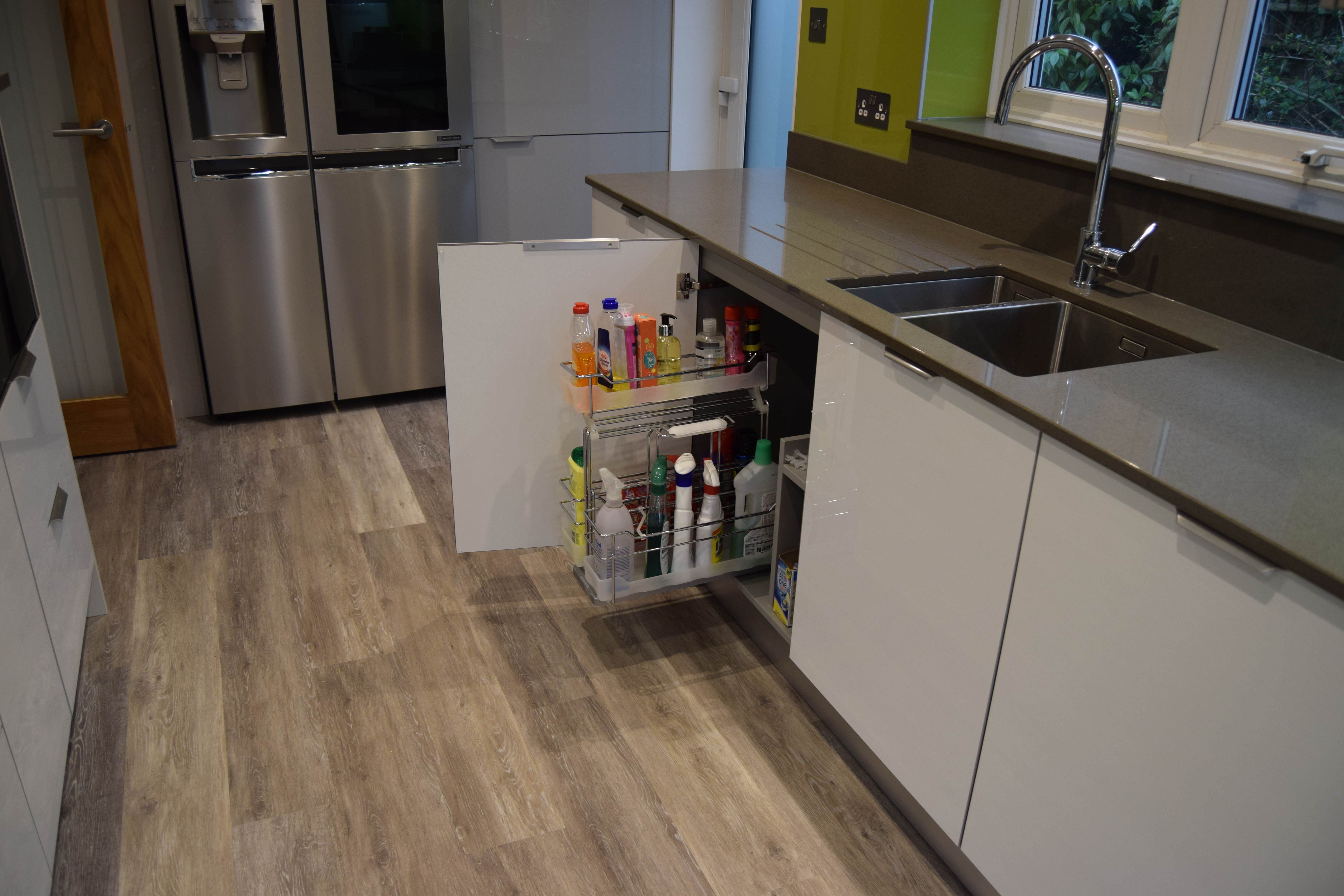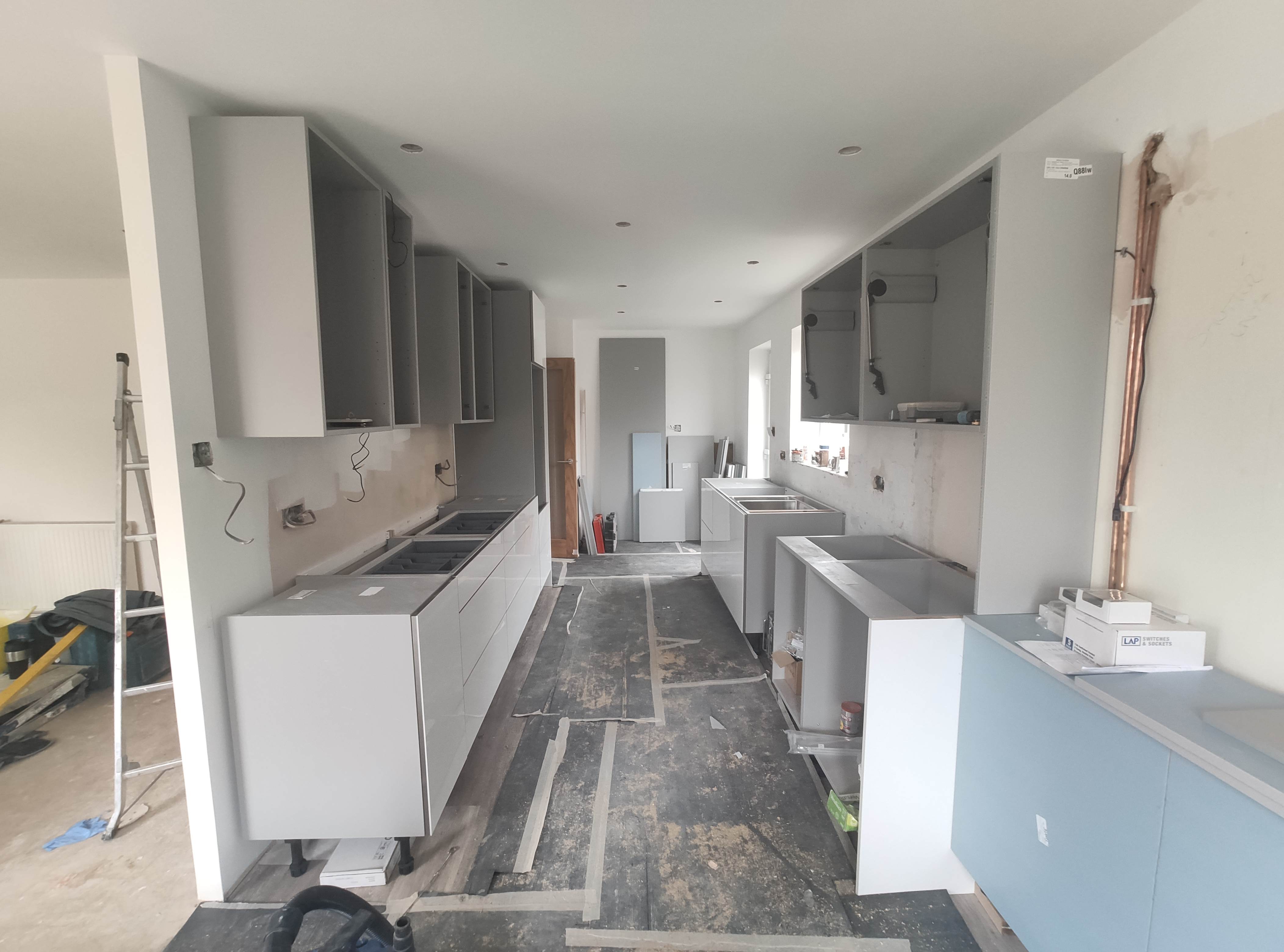 Complete kitchen re fit, supply and installation of new units, quartz worktops. Alusplash splash-backs.