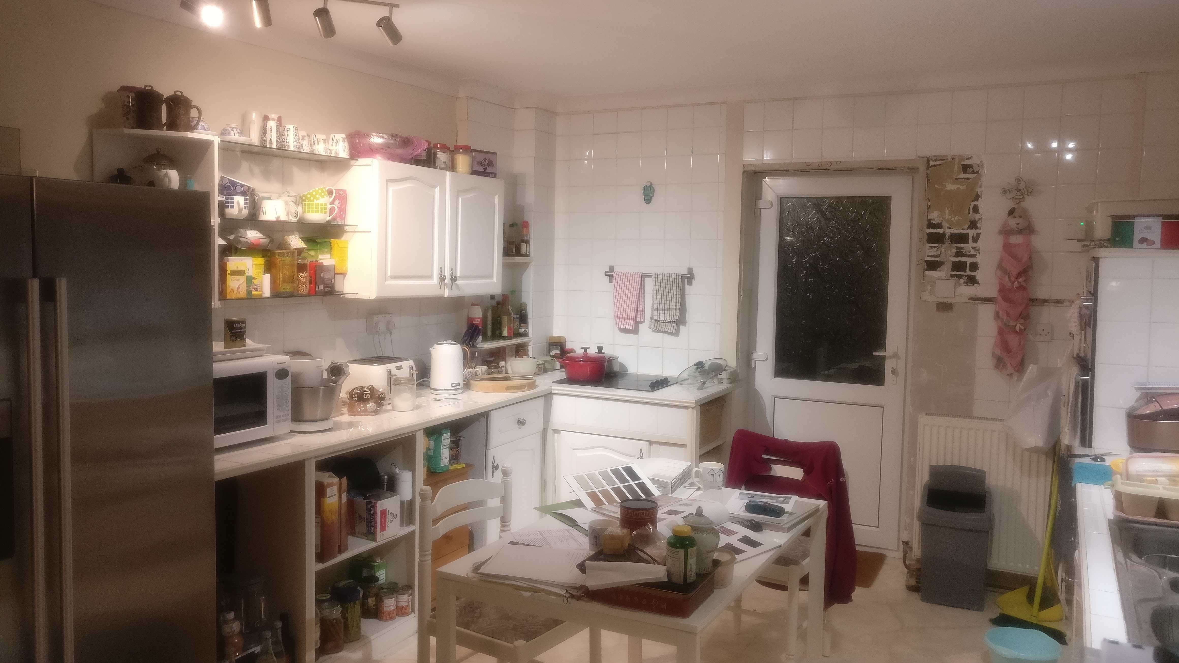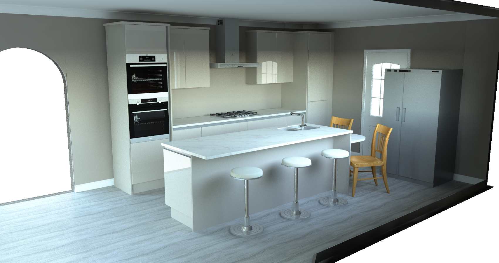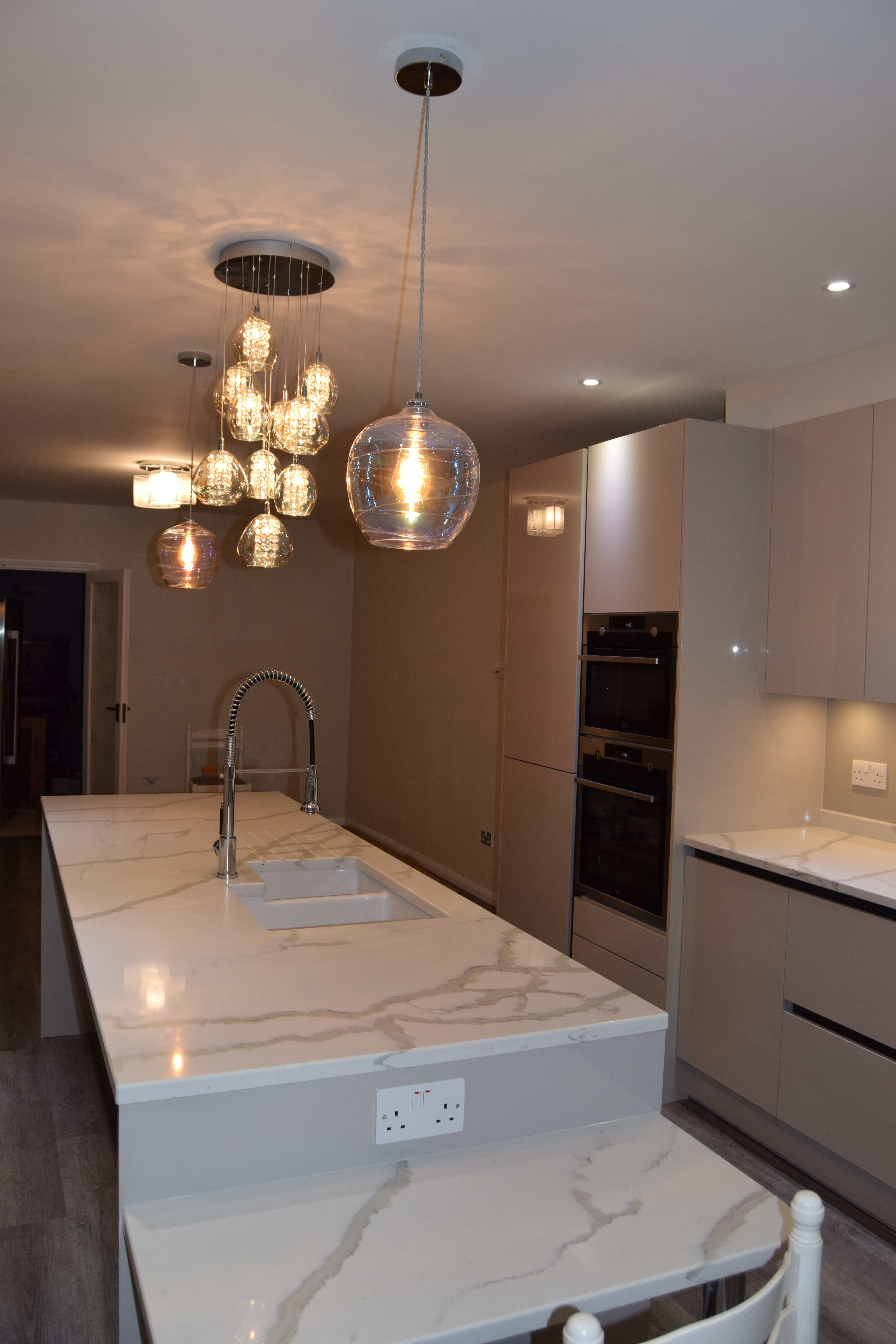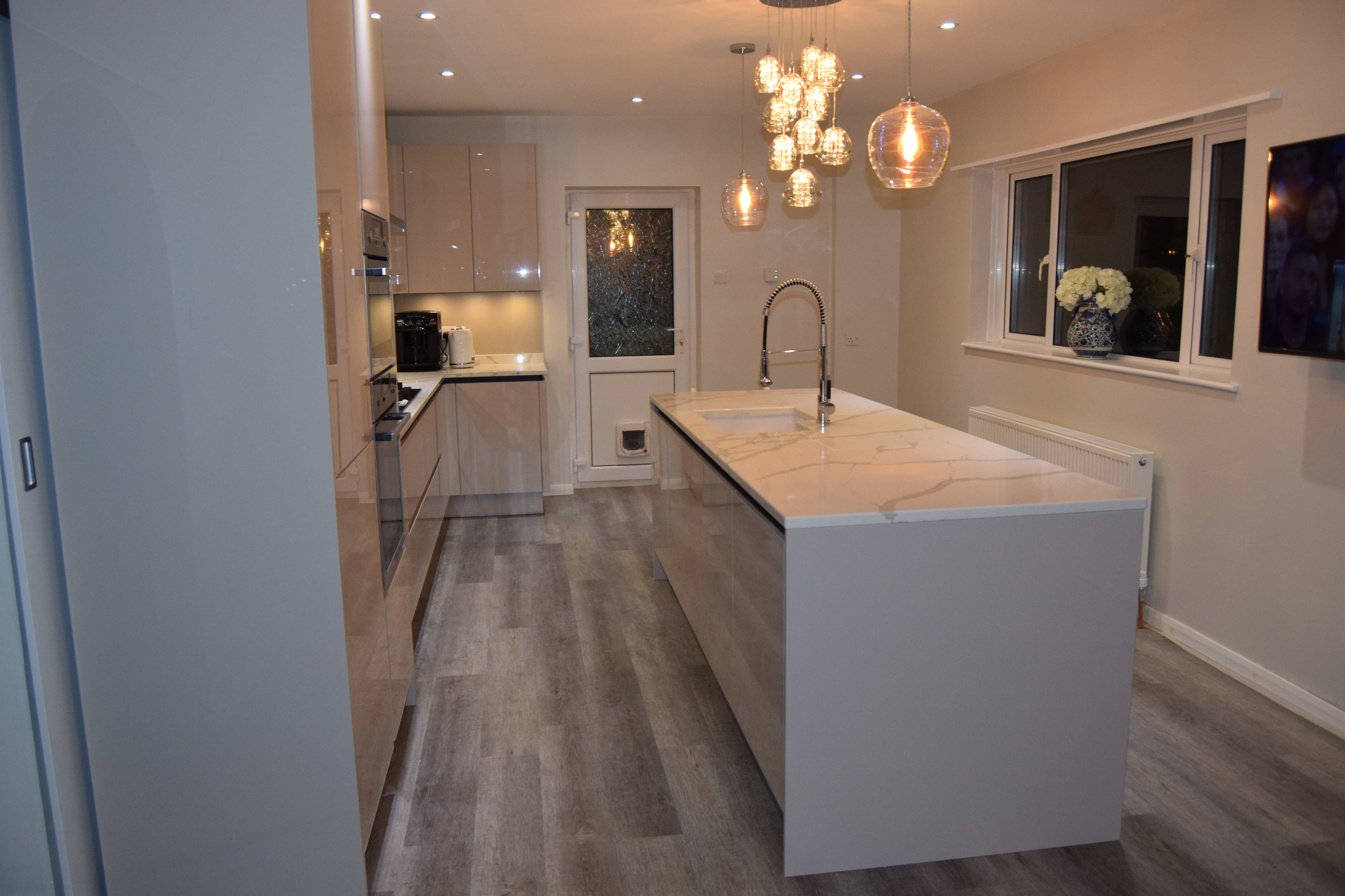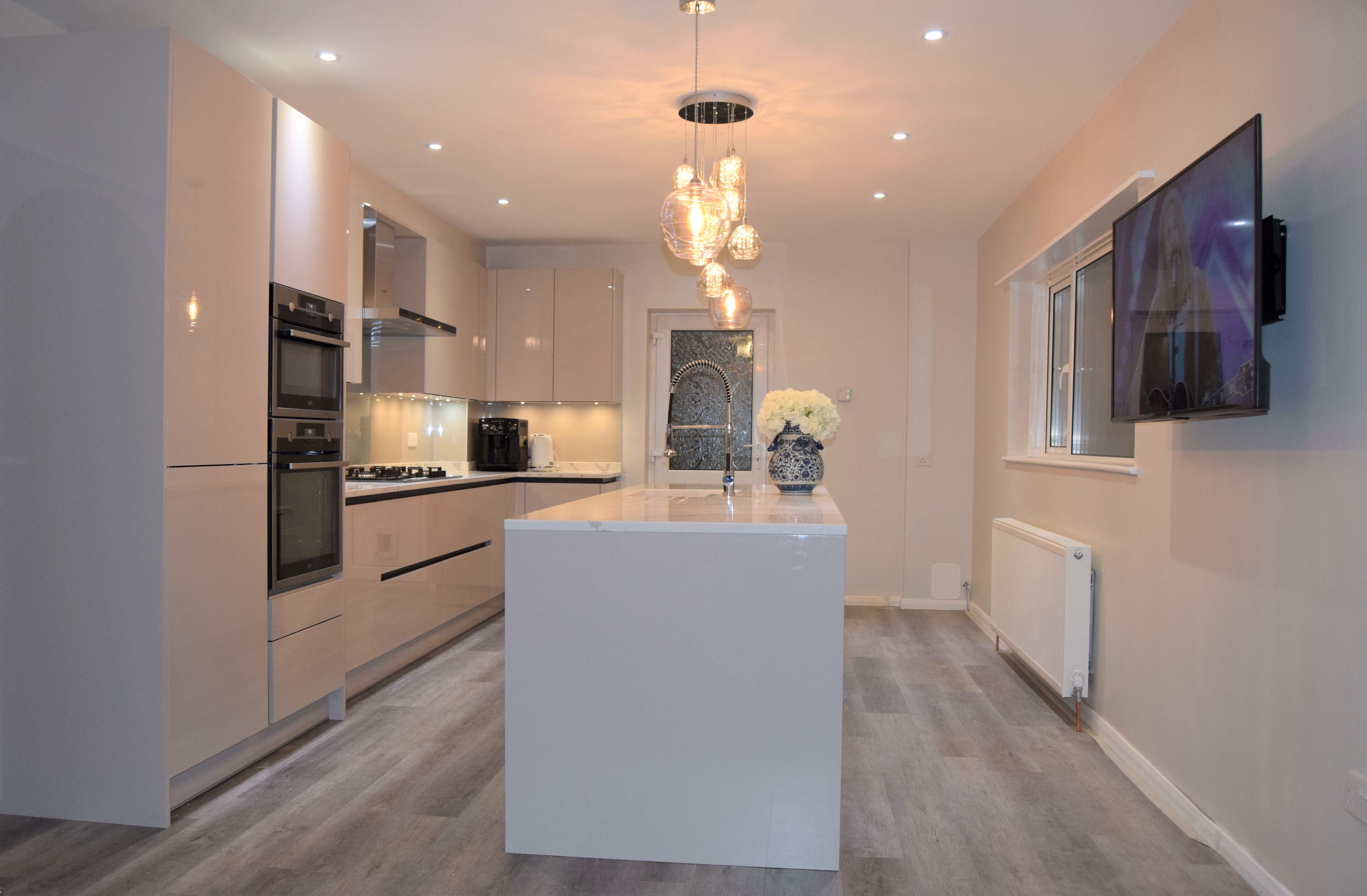 Handle-less kitchen units, Open plan island design, 30mm quartz worktops, new appliances, re-plastered room including new ceiling, ceiling lighting, sliding door to hall, new flooring throughout