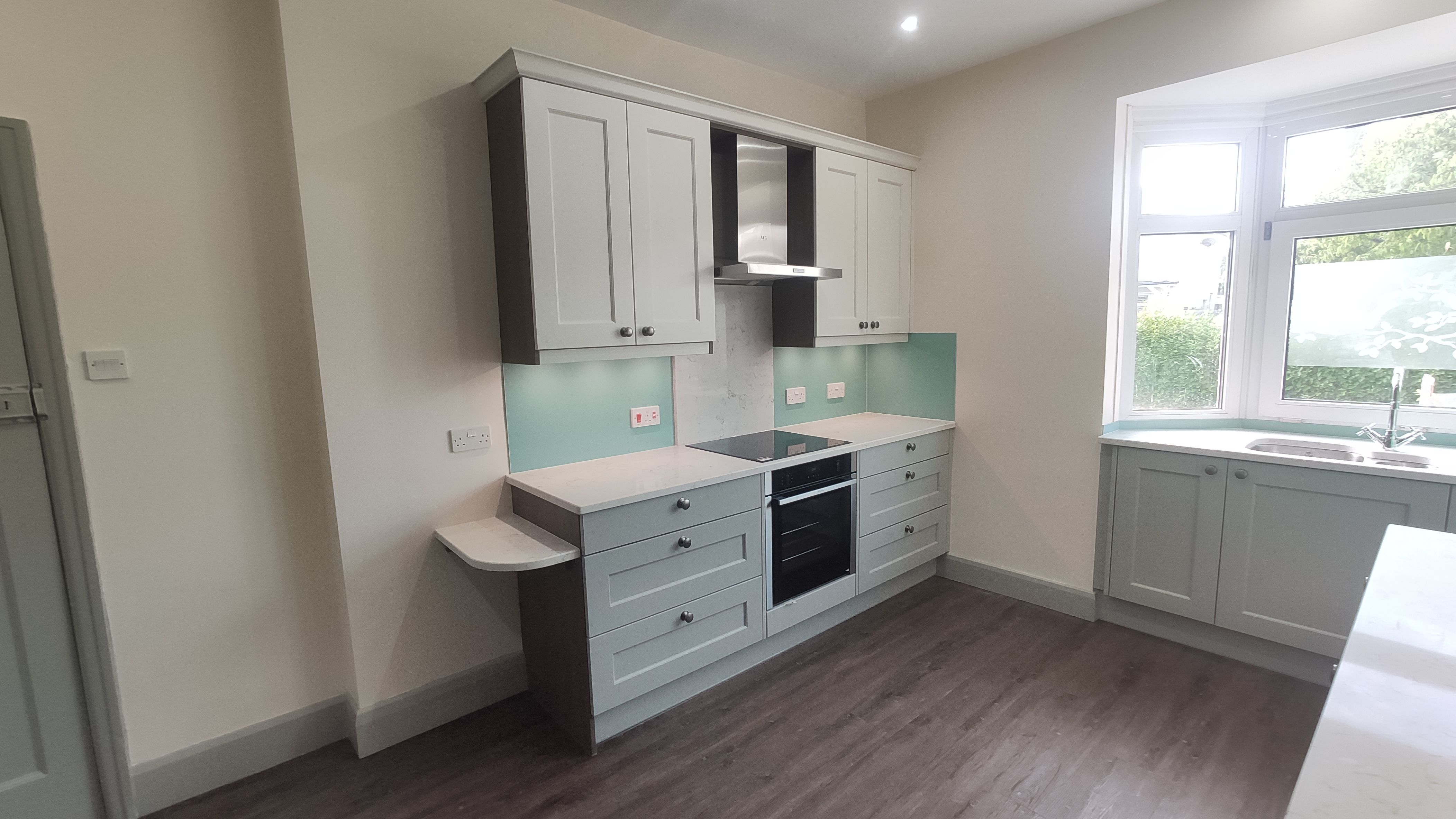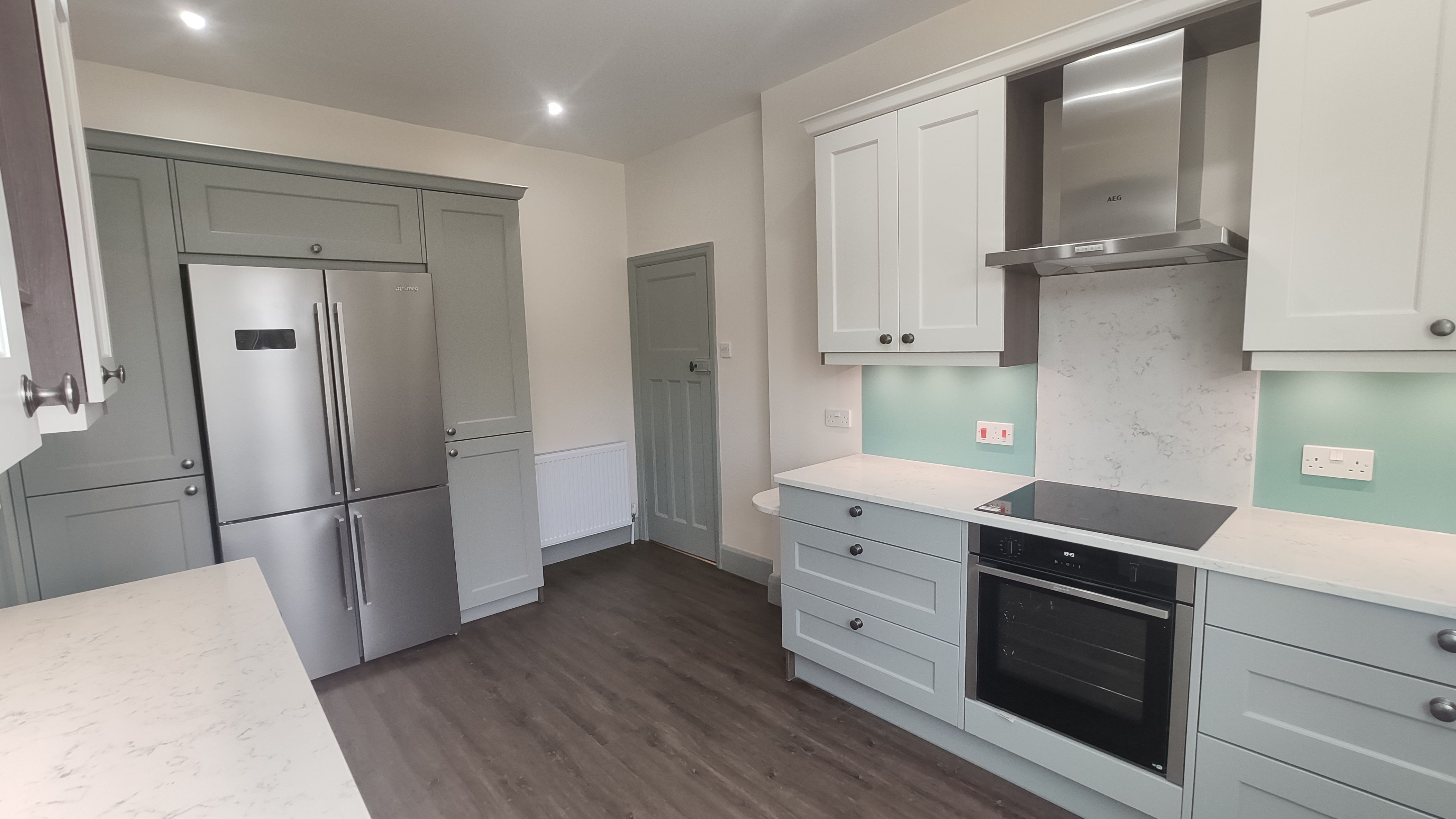 An American Fridge Freezer with 2 larder cupboards either side, a full kitchen replacement and Utility Room, plastering and painting.